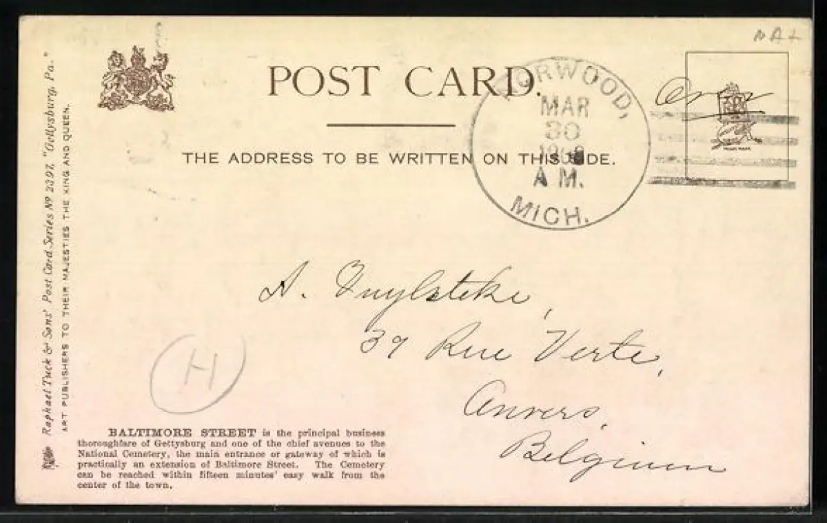 Personenbezogene Daten auf der Rückseite der Karte wurden durch blauen Textmarker unkenntlich gemacht. Die blauen Stellen sind auf die Vorderseite durchgeweicht und wirken sich negativ auf das Postkartenfoto aus