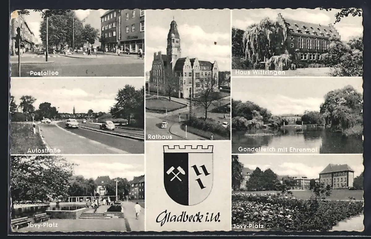 AK Gladbeck i. W., Rathaus, Haus Wittringen, Gondelteich mit Ehrenmal