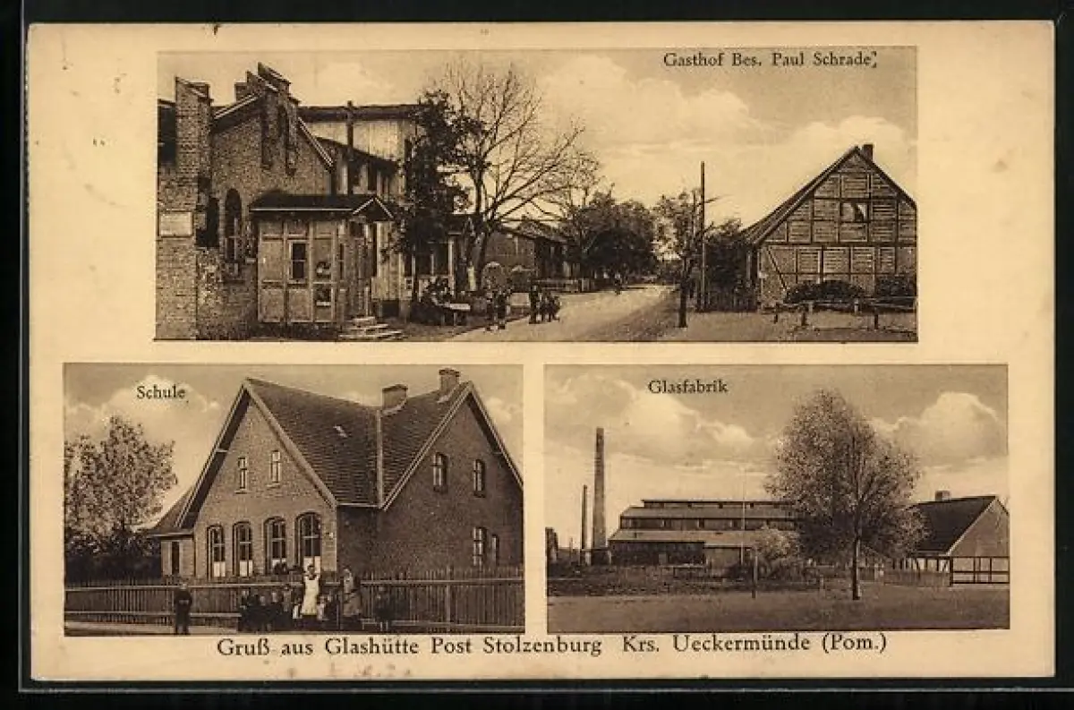 AK Glashütte /Rothenklempenow, Gasthof, Bes. Paul Schrade, Schule, Glasfabrik