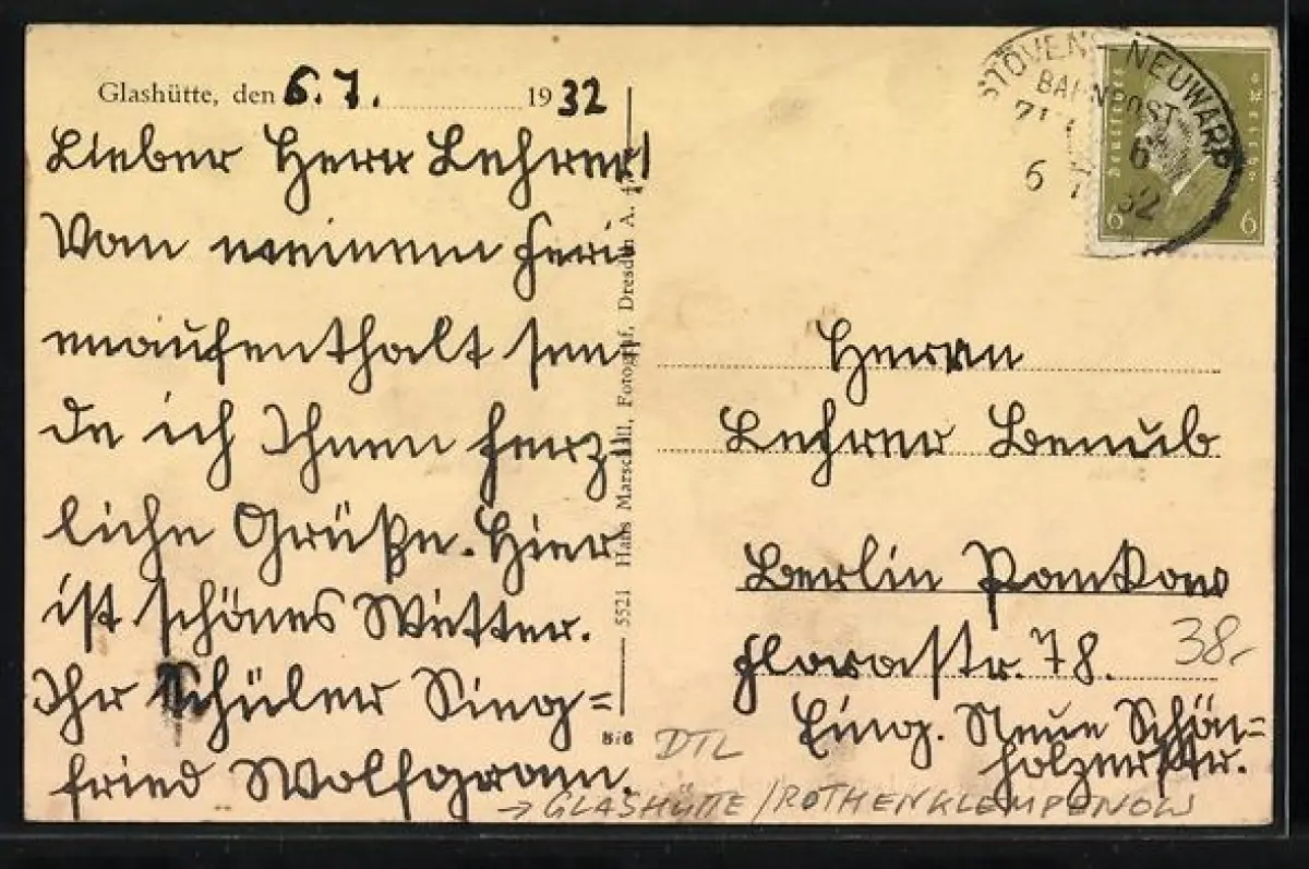 Personenbezogene Daten auf der Rückseite der Karte wurden durch blauen Textmarker unkenntlich gemacht. Die blauen Stellen sind auf die Vorderseite durchgeweicht und wirken sich negativ auf das Postkartenfoto aus
