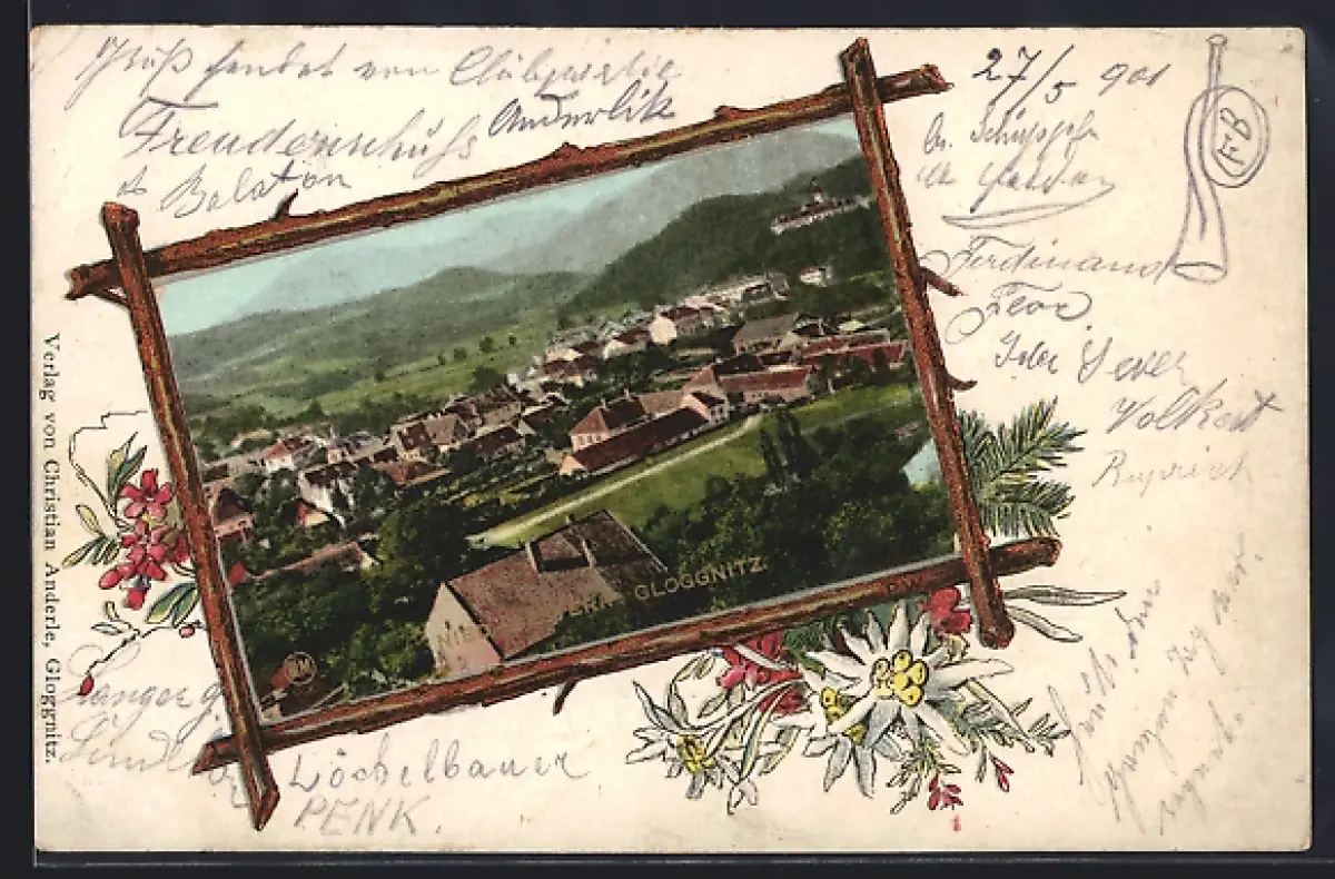 AK Gloggnitz /Nied.-Oesterr., Teilansicht, Alpenblumen, Passepartout