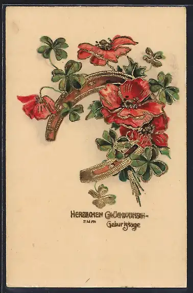 AK Glückwunsch zum Geburtstag, Goldenes Hufeisen mit Mohnblüten und Kleeblättern