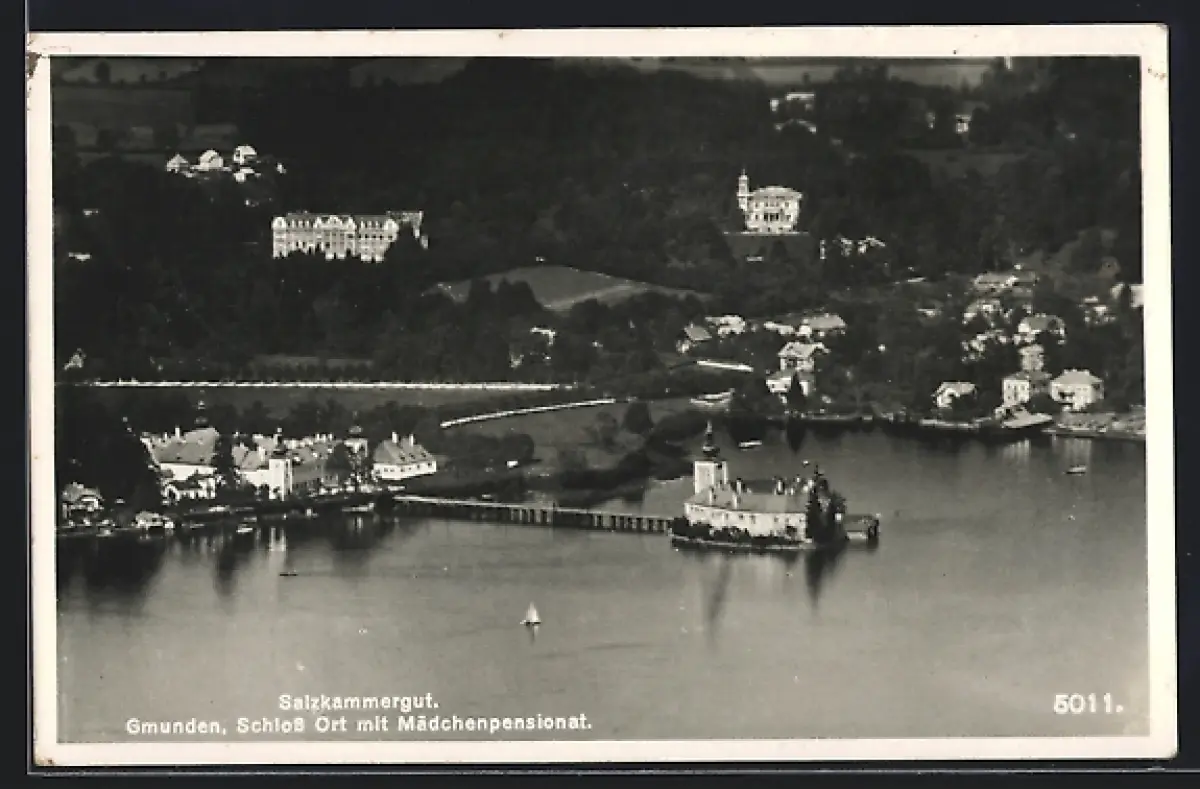 AK Gmunden /Salzkammergut, Schloss Ort mit Mädchenpensionat aus der Vogelschau