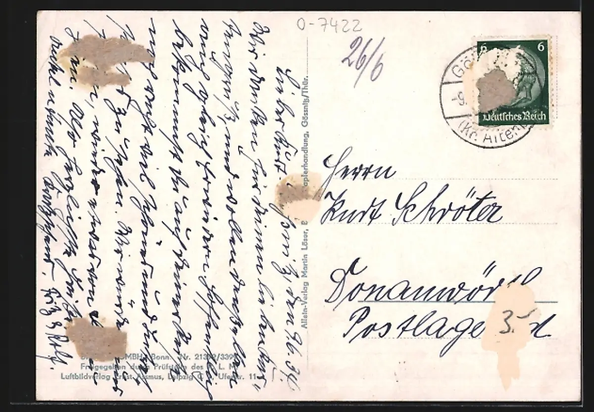 gelaufen, Briefmarke entfernt, rückseitig Klebe- und Papierreste, rückseitig Oberflächenschaden, Eckknick oben rechts