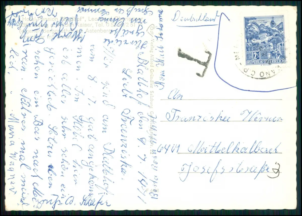 Gelaufen 09.07.1971, frankiert mit 2-Schilling-Briefmarke der Republik Österreich (Klagenfurt-Motiv), Stempel St. Johann in Tirol, handschriftlich beschrieben. Adressiert nach Mittelkalbach.
