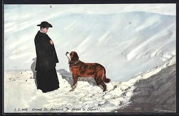 AK Grand St. Bernard, Bernhardiner im Schnee mit seinem Herrchen