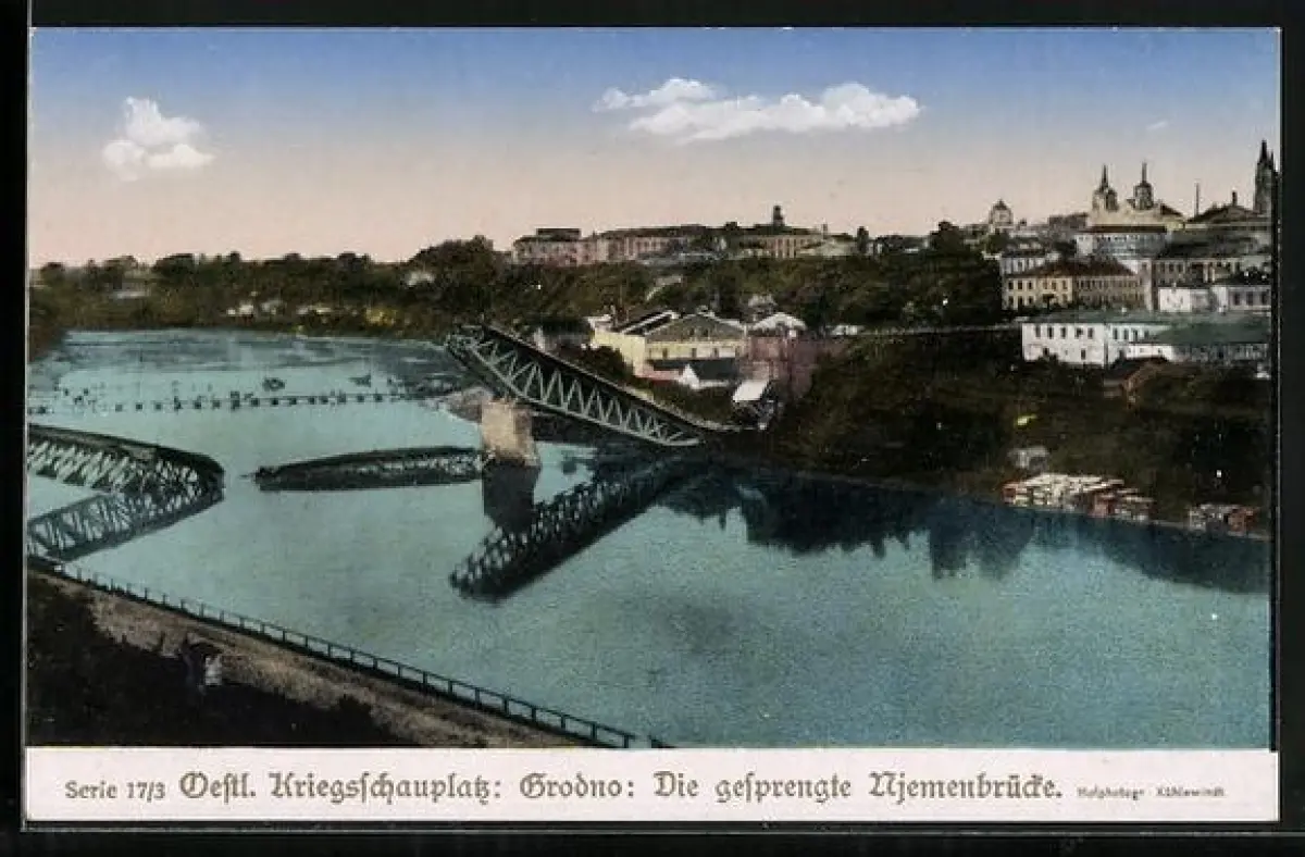AK Grodno, gesprengte Njemenbrücke aus der Vogelschau