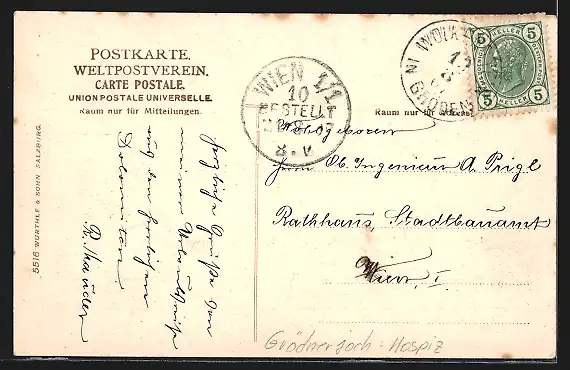 Personenbezogene Daten auf der Rückseite der Karte wurden durch blauen Textmarker unkenntlich gemacht. Die blauen Stellen sind auf die Vorderseite durchgeweicht und wirken sich negativ auf das Postkartenfoto aus