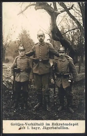 AK Grössenverhältnis dreier uniformierter Soldaten des 1. bayr. Jägerbataillons