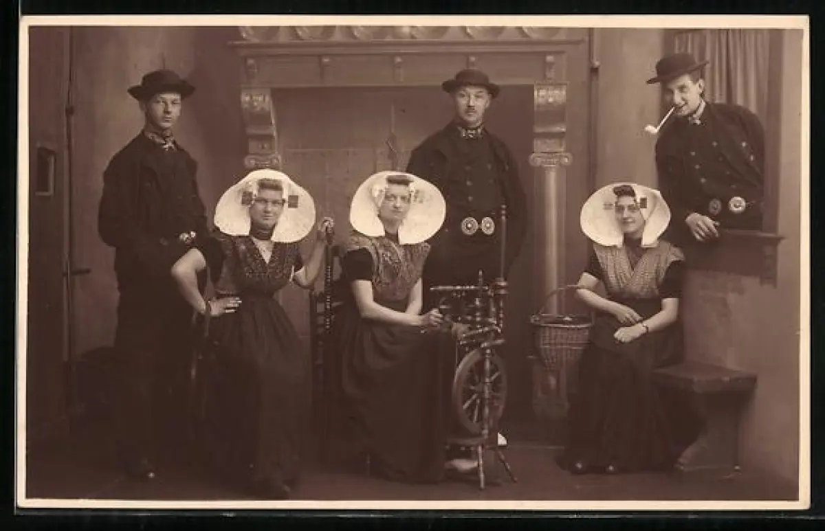 AK Gruppe in Trachten mit Spinnrad