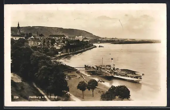 AK Hainburg a. d. Donau, Uferpanorama mit Bootsanleger
