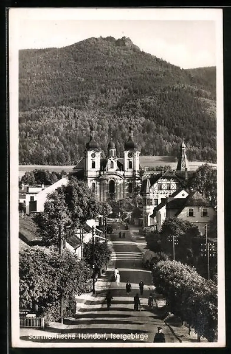 AK Haindorf-Hejnice, Strassenpartie mit Blick zur Klosterkirche und den Bergen im Hintergrund