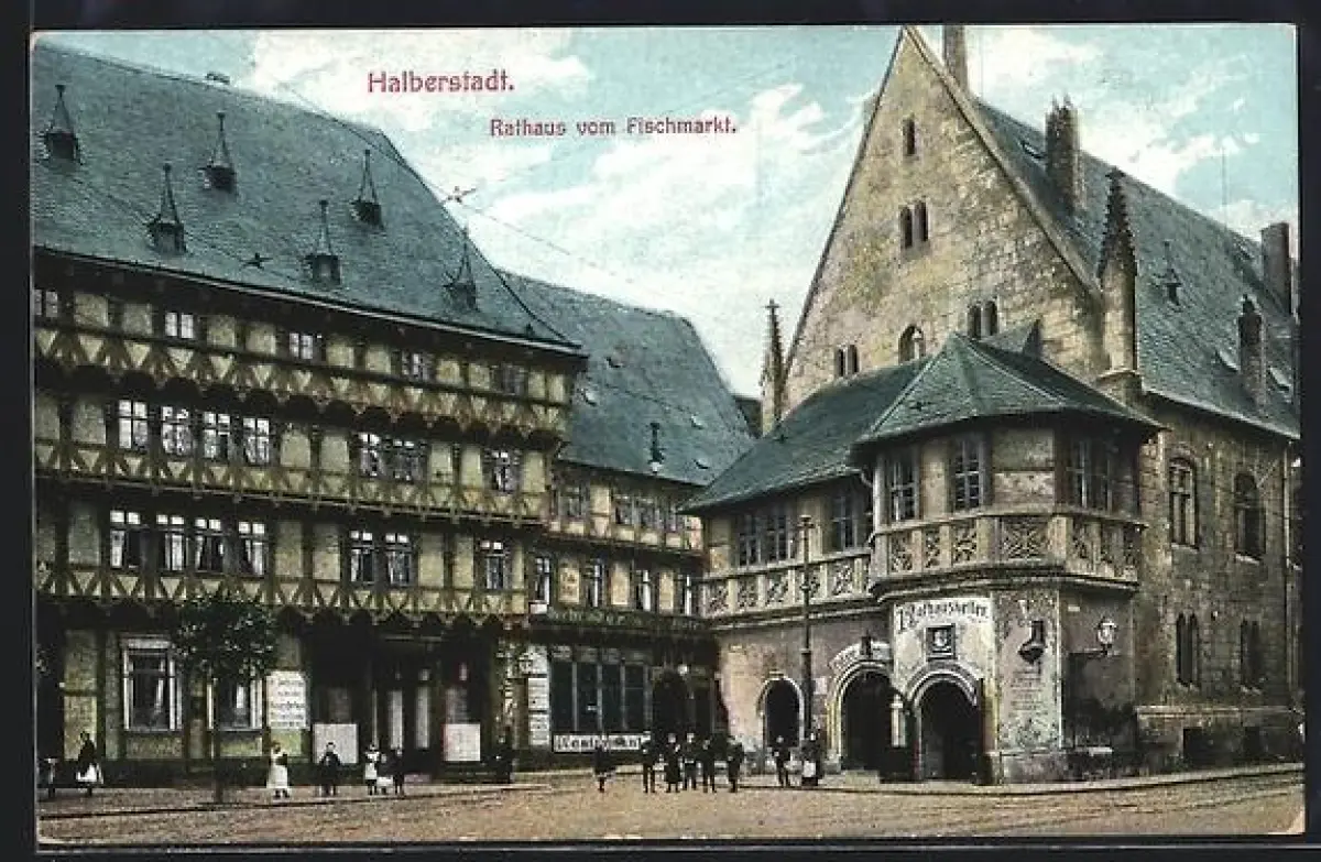 AK Halberstadt, Fischmarkt mit Rathaus, Polizeiwache neben dem Rathauskeller
