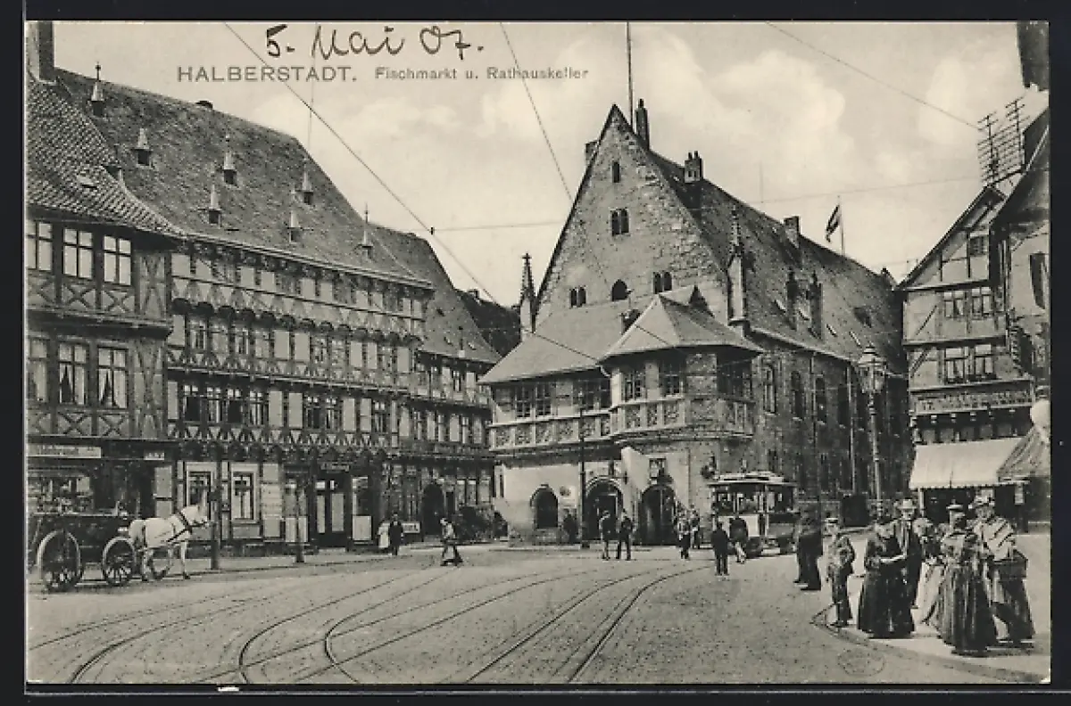 AK Halberstadt, Rathauskeller, Fischmarkt und STrassenbahn