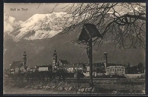 AK Hall in Tirol, Ortsansicht mit Flurkreuz