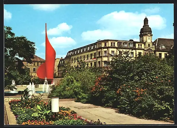 AK Halle /Saale, Parkansicht mit Fahnenmonument Flamme der Revolution