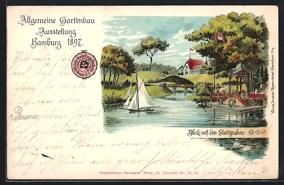 AK Hamburg, Allgemeine Gartenbau-Ausstellung 1897, Blick auf den Stadtgraben mit Segelboot und Seerosen