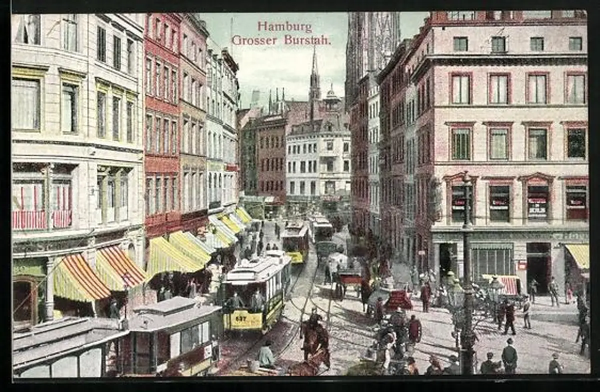 AK Hamburg, Grosser Burstah, Strassenbahnen, Geschäfts-und Häuserfassaden