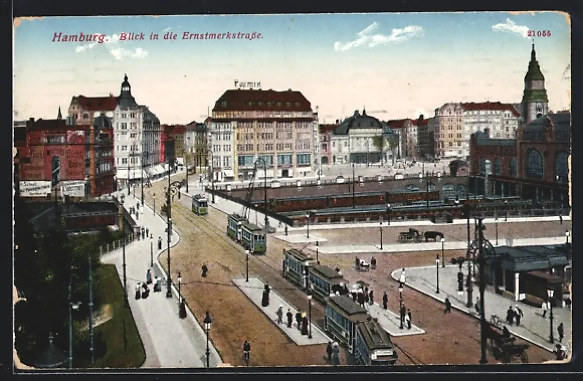 AK Hamburg-Neustadt, Strassenbahnen in der Ernstmerkstrasse, Pferdekutsche