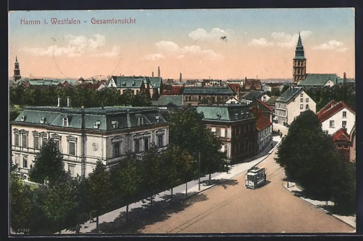 AK Hamm i. Westfalen, Gesamtansicht und Strassenbahn und Strassenbahn
