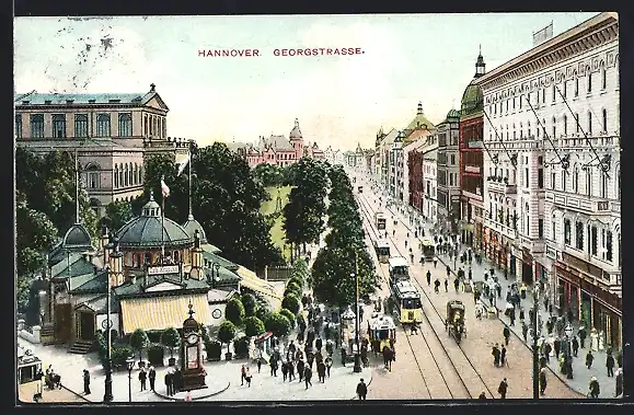 AK Hannover, Strassenbahn an der Georgstrasse, mit Café Kröpcke
