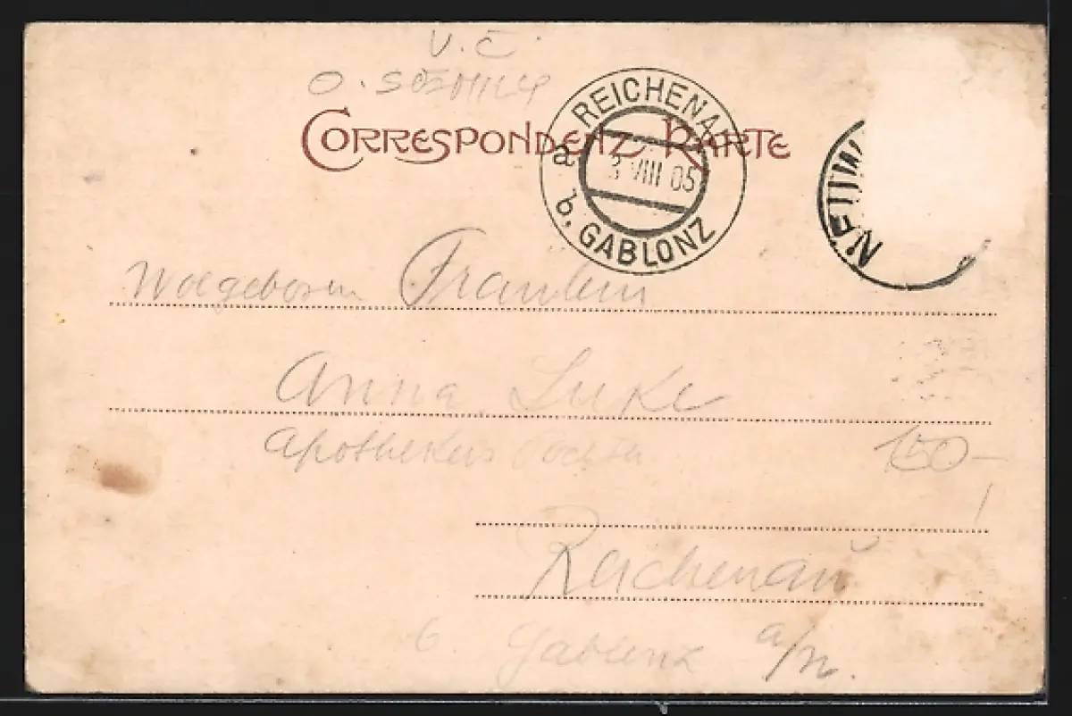 gelaufen 1905, Briefmarke entfernt, rückseitig Oberflächenschaden, geklebter Eckknick unten re., vor- u. rückseitig Klebe- und Papierreste, guter Zustand