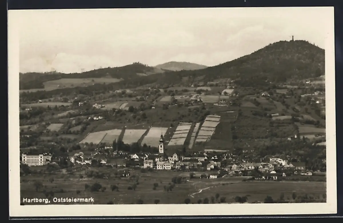 AK Hartberg /Oststmk., Ortsansicht vor Feldern und Berg