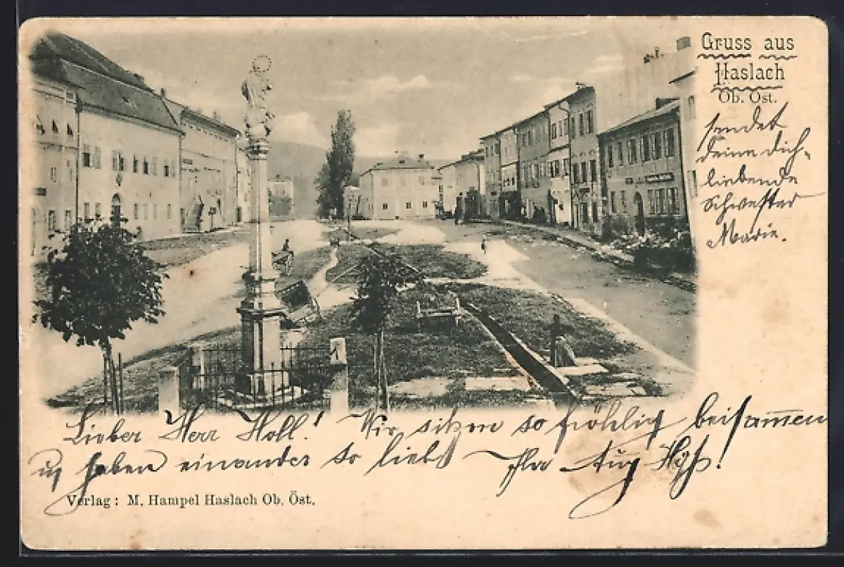 AK Haslach /Ob. Öst., Denkmal mit Strassenpartie