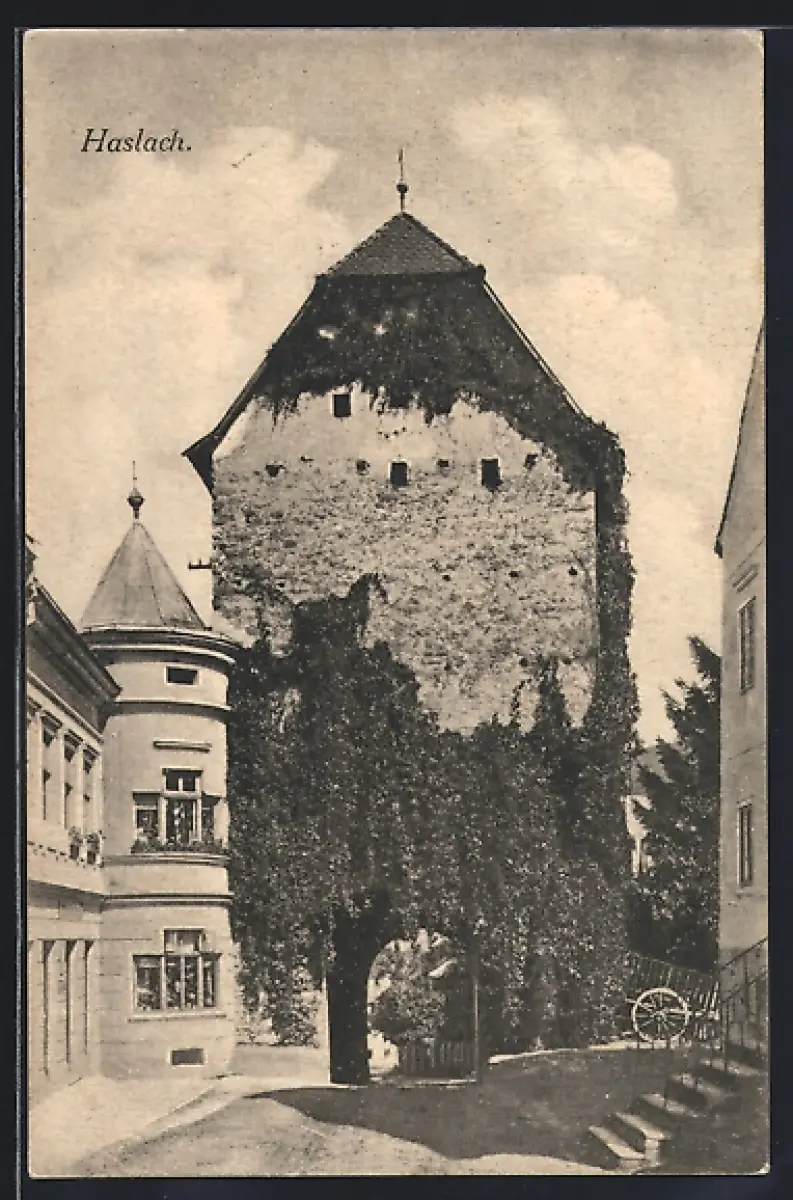 AK Haslach, Strassenpartie mit Torturm und Turmhaus