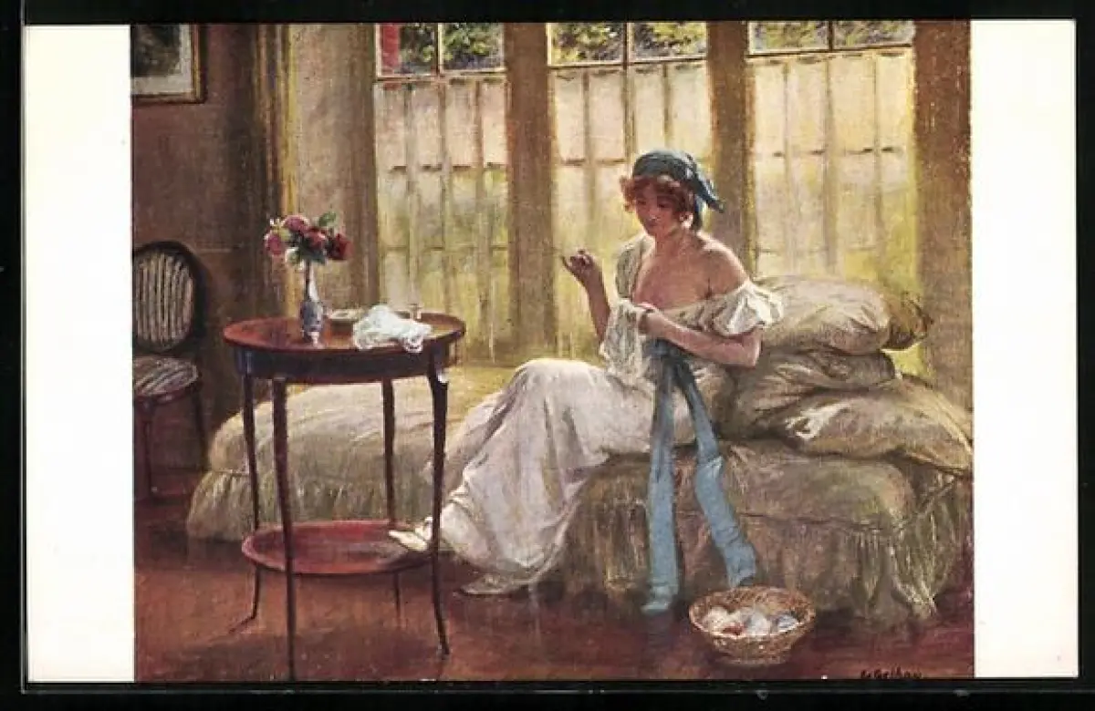 AK Heimarbeit, Junge Frau sitzt bei Näharbeit auf einem Bett