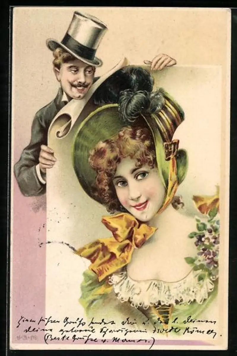 AK Herr hält Bild von einer jungen Dame, Biedermeier