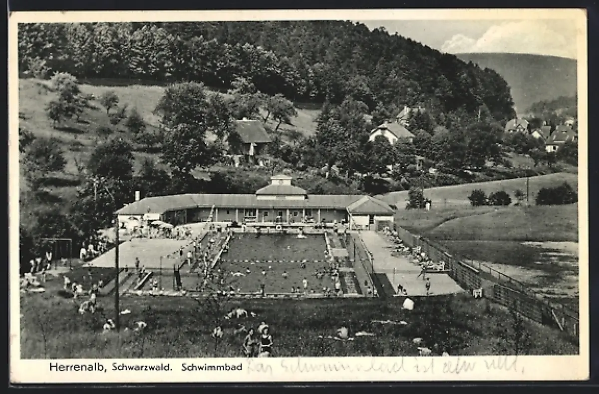 AK Herrenalb /Schwarzwald, Schwimmbad mit Badegästen u. Ortsblick