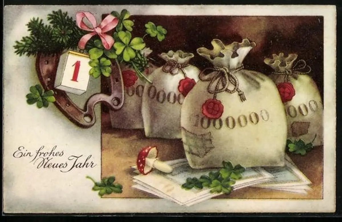 AK Herzliche Glückwünsche zum neuen Jahre, erstes Kalenderblatt, Hufeisen u. Geldsäcke m. Glücksklee u. Fliegenpilz