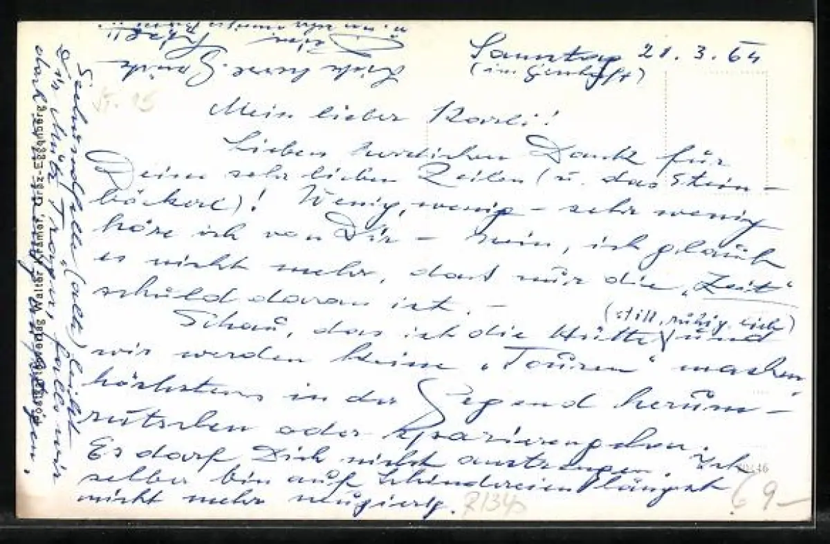 Personenbezogene Daten auf der Rückseite der Karte wurden durch blauen Textmarker unkenntlich gemacht. Die blauen Stellen sind auf die Vorderseite durchgeweicht und wirken sich negativ auf das Postkartenfoto aus