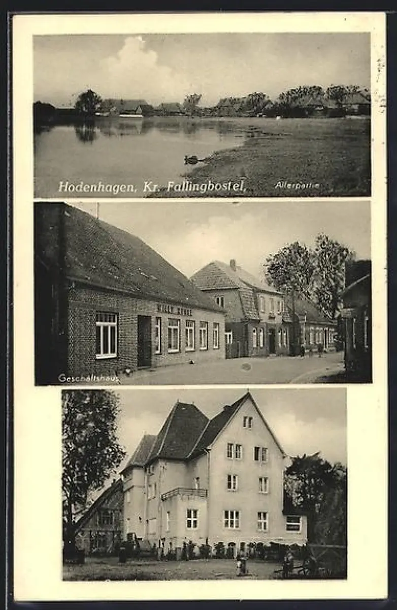 AK Hodenhagen, Strassenpartie am Geschäftshaus Willy Runge, Allerpartie