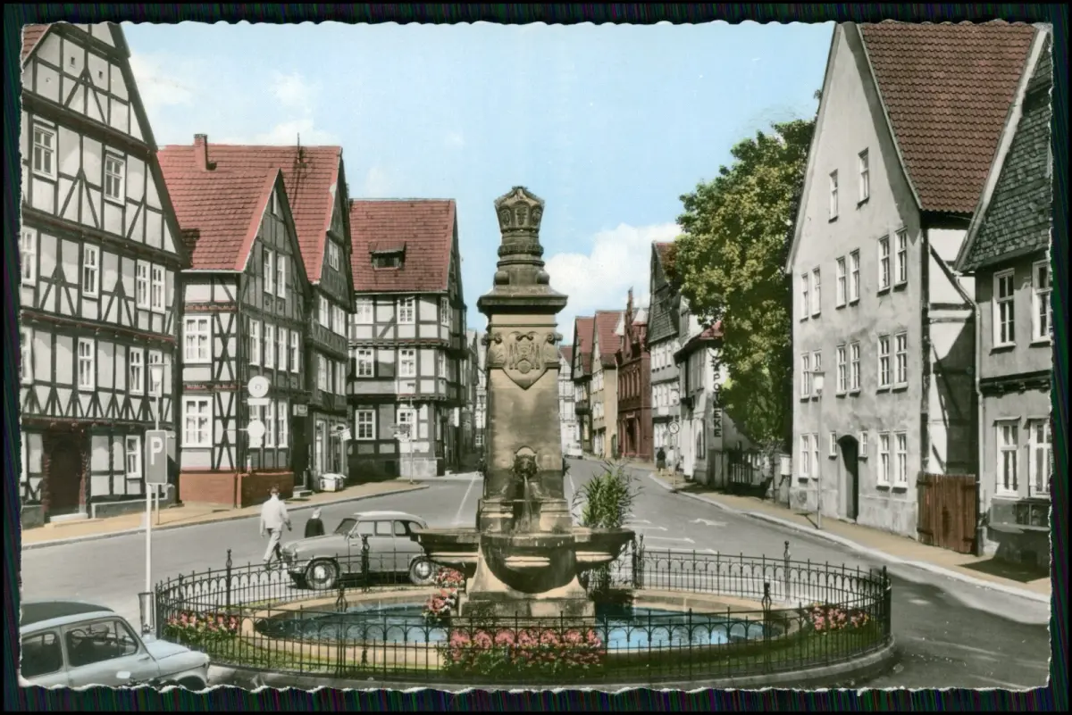 Motiv: In der Mitte steht ein steinener Brunnen mit Krone, umgeben von Blumenbeeten und Gitterzaun. Umrahmt wird der Platz von beeindruckenden Fachwerkfassaden. Auf der Straße parken zeittypische Fahrzeuge (DKW, Fiat). Im Hintergrund erkennt man die Apotheke – ein klassisches Bild der westdeutschen Kleinstadtarchitektur der Nachkriegszeit.