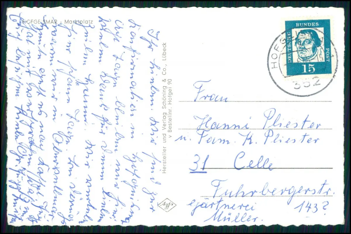 Rückseite: Karte ist handschriftlich beschrieben und an Frau Hanni Pliester in Celle adressiert. Verlagsangabe: Schöning & Co., Lübeck, Bestell-Nr. Holger 90.