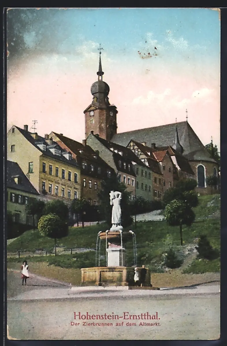 AK Hohenstein-Ernstthal, Zierbrunnen auf dem Altmarkt, Kirche