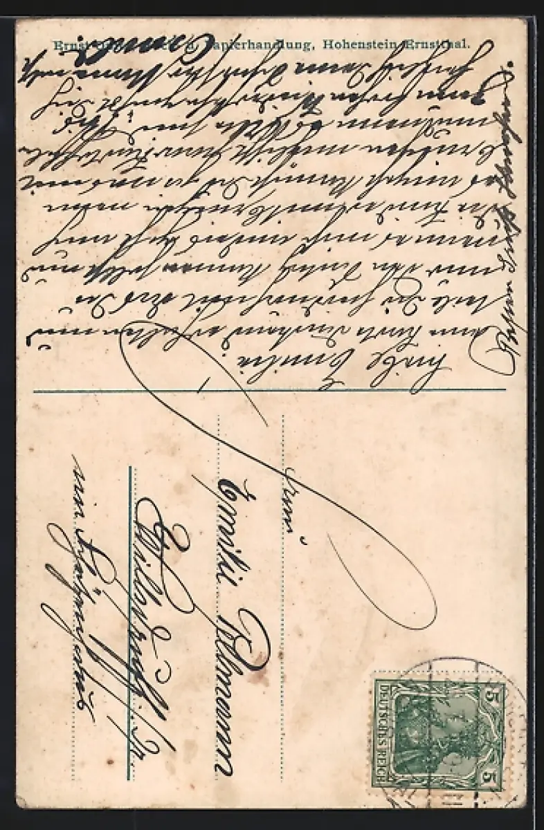 Personenbezogene Daten auf der Rückseite der Karte wurden durch blauen Textmarker unkenntlich gemacht. Die blauen Stellen sind auf die Vorderseite durchgeweicht und wirken sich negativ auf das Postkartenfoto aus