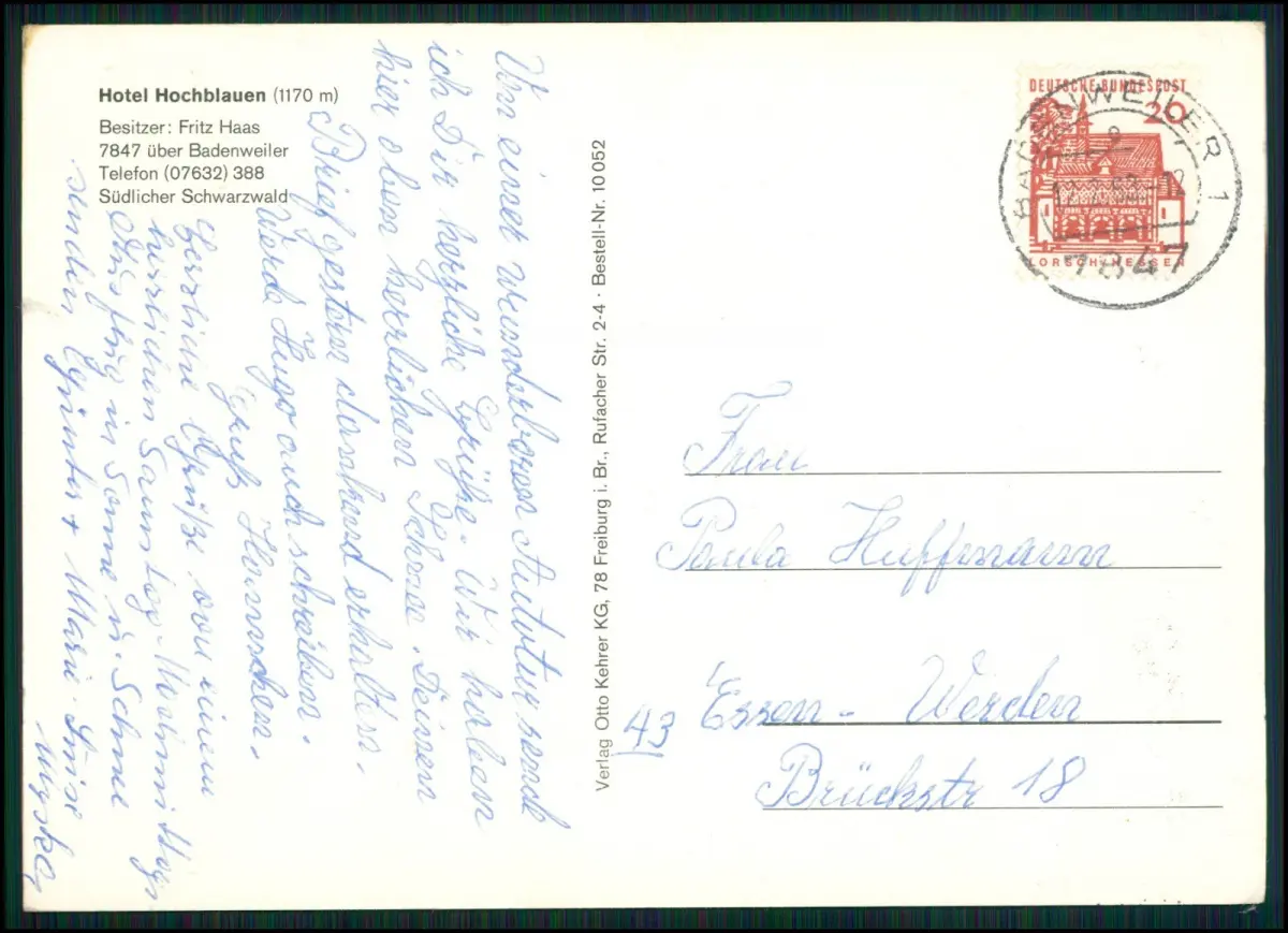 Rückseite: Handschriftlich beschriftet, gelaufen an „Paula Huffmann, Essen-Werden“, mit lesbarer Poststempelung und Briefmarke mit Motiv Torschänke Meersburg (MiNr. 1237). Herausgeber: Verlag Otto Kehrer KG Freiburg.