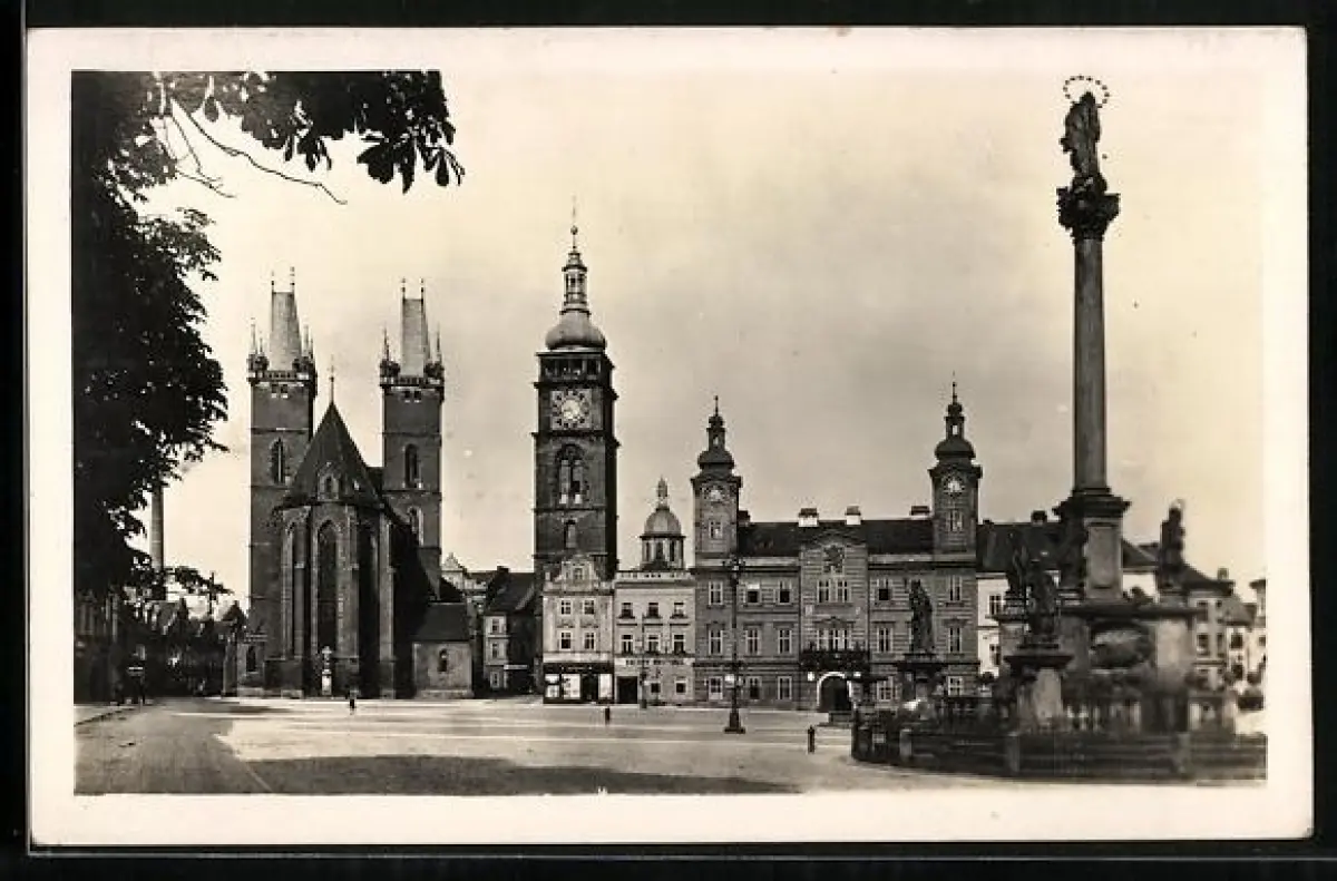 AK Hradec Kralove, Turmpanorama mit Kirche u. Säulendenkmal