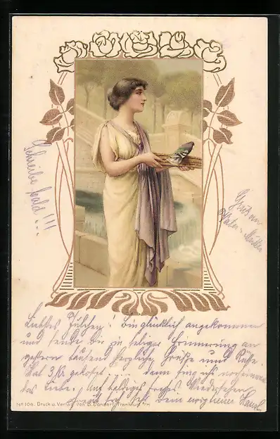 AK Hübsches Mädchen mit einer Taube, Jugendstil