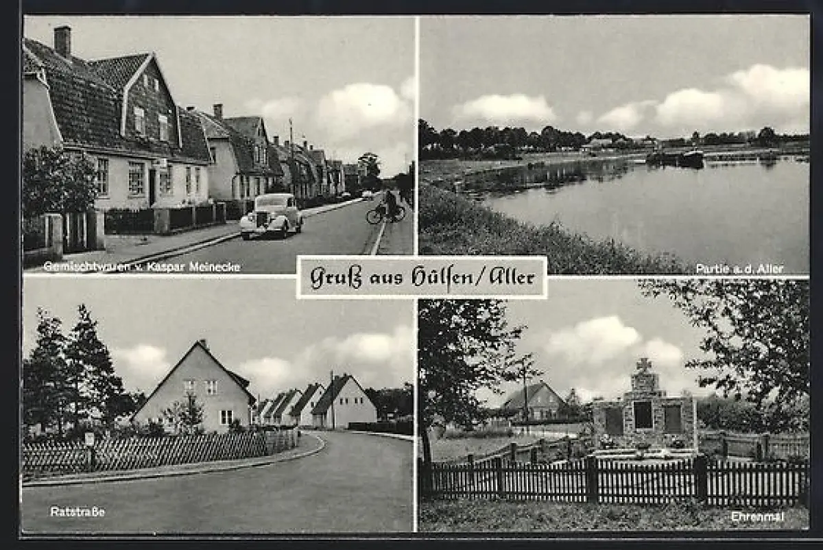 AK Hülsen /Aller, Gemischtwaren v. Kaspar Meinecke, Partie a. d. Aller, Ehrenmal, Ratstrasse