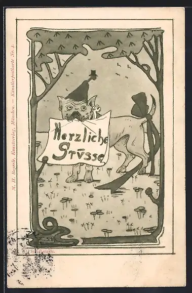 AK Hund mit Grussschild, Spitzhut und Schleife am Schwanz