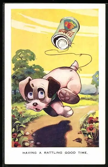 AK Hund mit Konservenbüchse am Schwanz jagt über die Landstrasse
