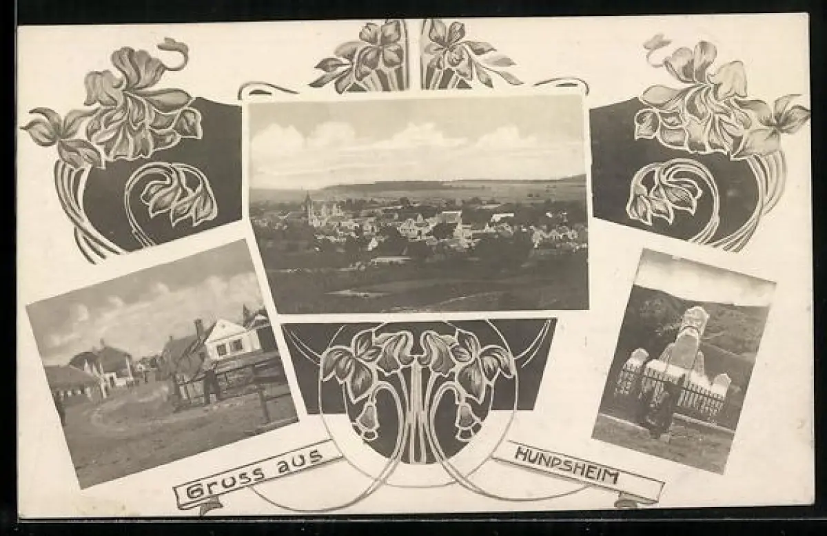 AK Hundsheim, Totalansicht, Strassenpartie und Denkmal im Blumen-Passepartout