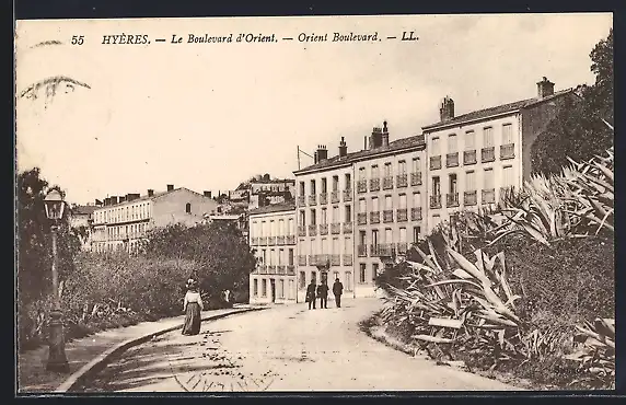 AK Hyères, Le Boulevard d`Orient avec passants et bâtiments historiques