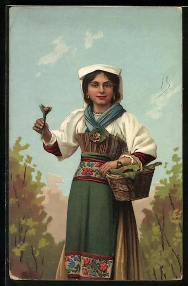 AK Italienerin in Tracht hält Korb und Blume in den Händen