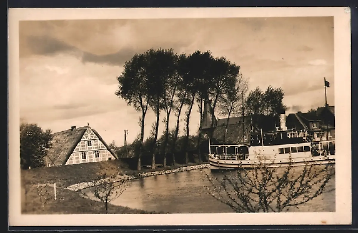 AK Jork, Am Hafen, Fachwerkhaus, Dampfer