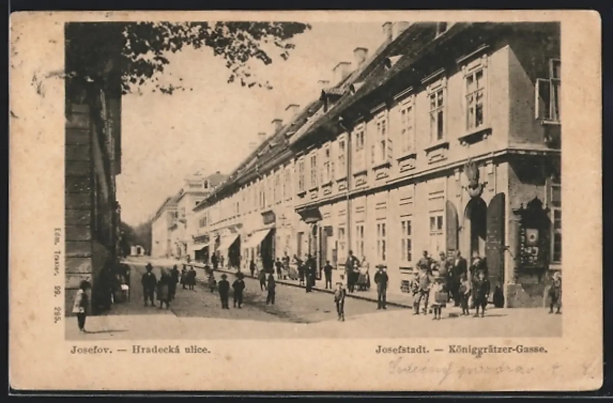 AK Josefstadt, Königgrätzer Gasse mit Geschäften und Kindergruppe, Strassenpartie
